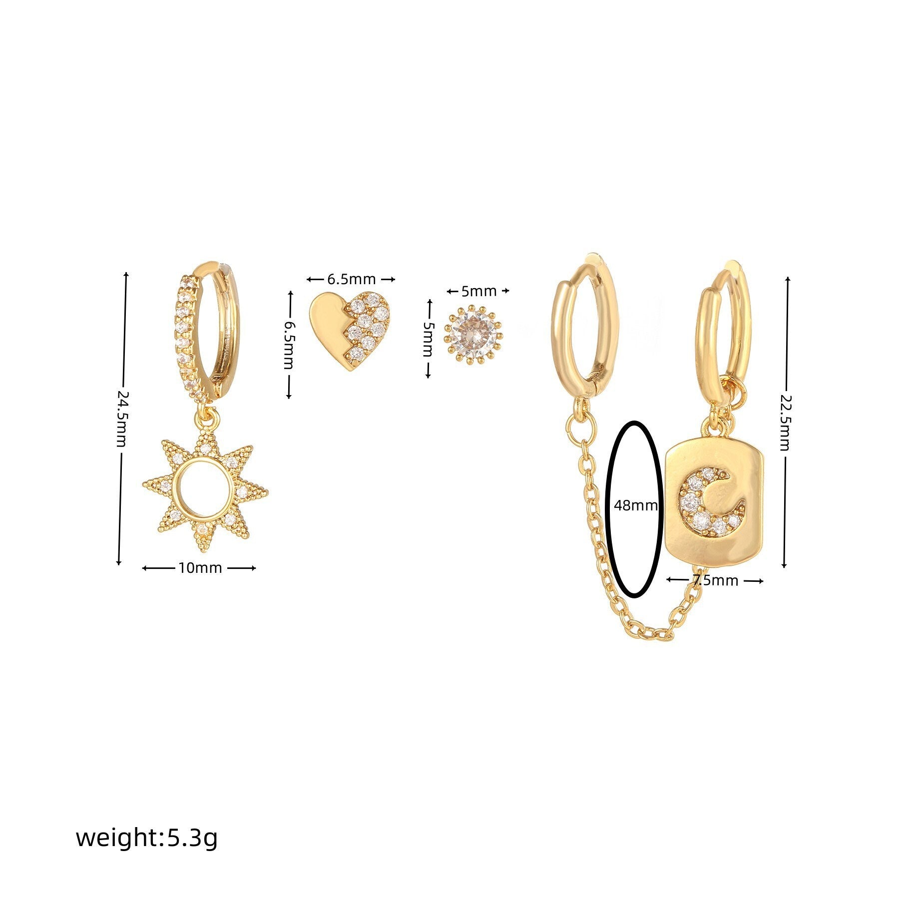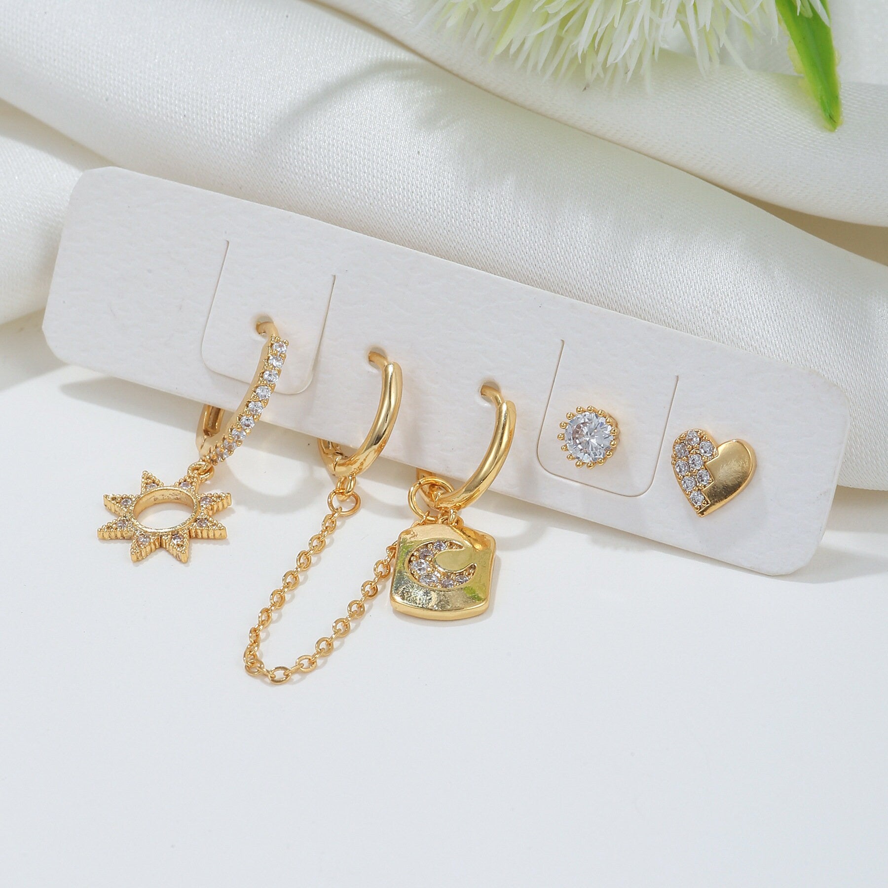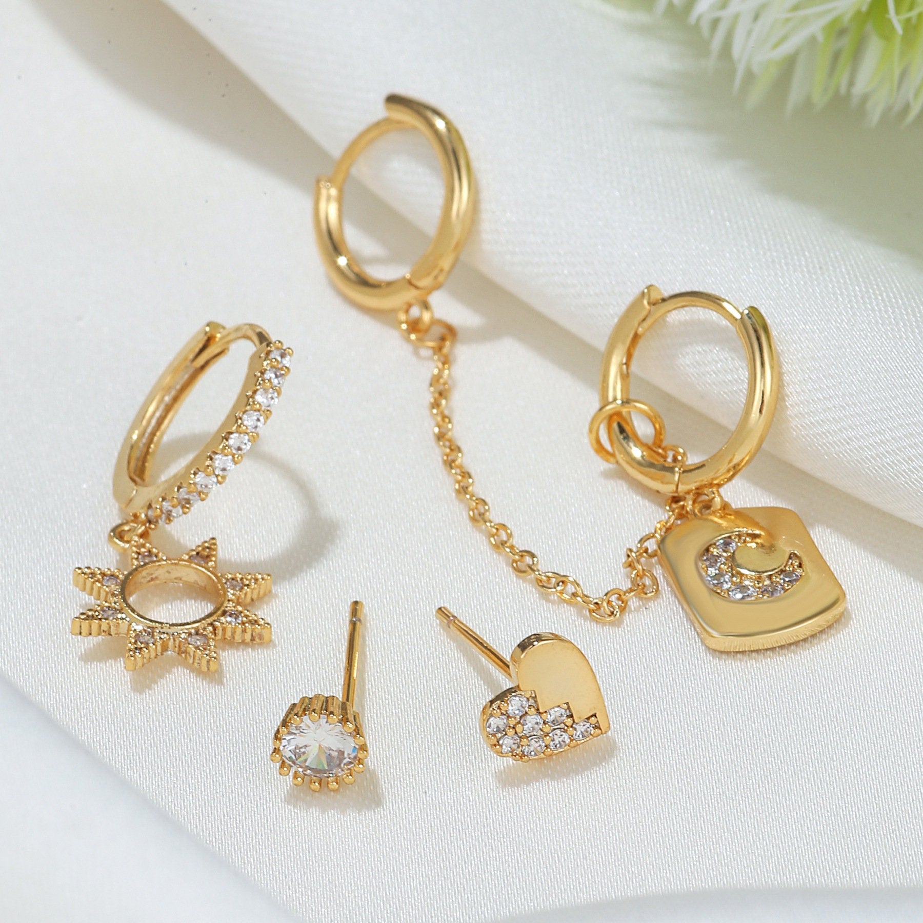 SOLAR RAY - GOLD Celestial Multiple Pieces Earrings Set, Moon Star Heart Sun Design, Dangling Linked Chain Earrings Stud, Best Gift For Her